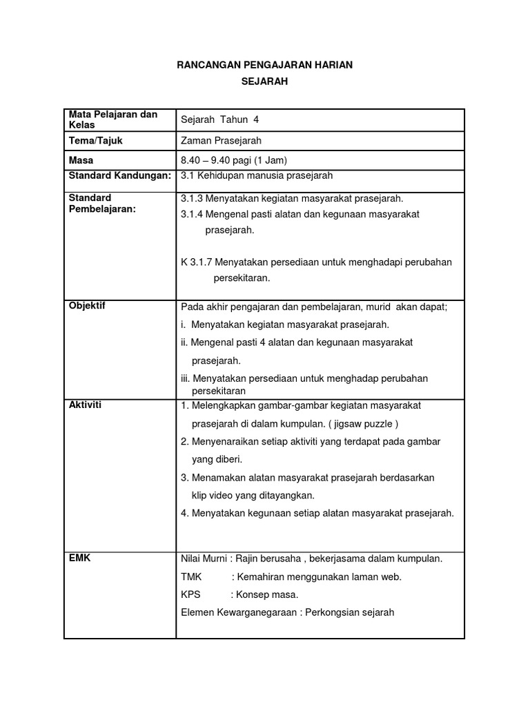 3 1 Rph Zaman Prasejarah 4 Avvai Part 2 Doc Rancangan Pengajaran Harian Sejarah Mata Pelajaran Sejarah Tahun 4 Avvai Bilangan Murid 32 Orang Tarikh Course Hero
