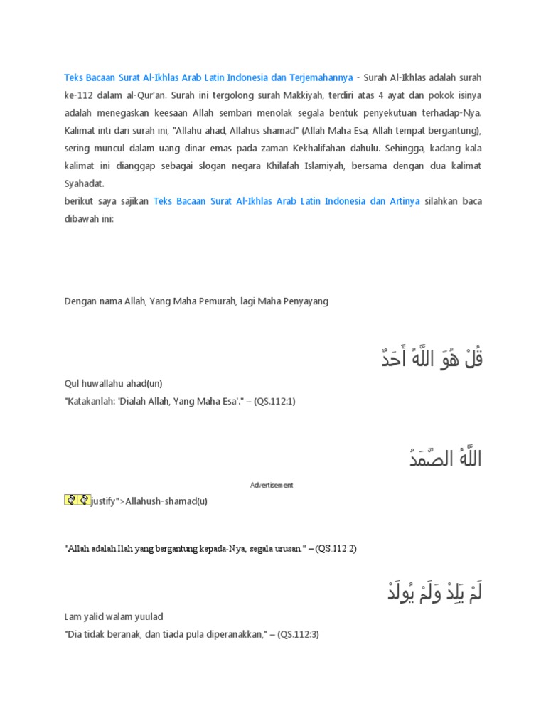 Surah Al Ikhlas Ayat 1 4 Arab Latin Dan Artinya Dalam Bahasa Indonesia Portal Jember