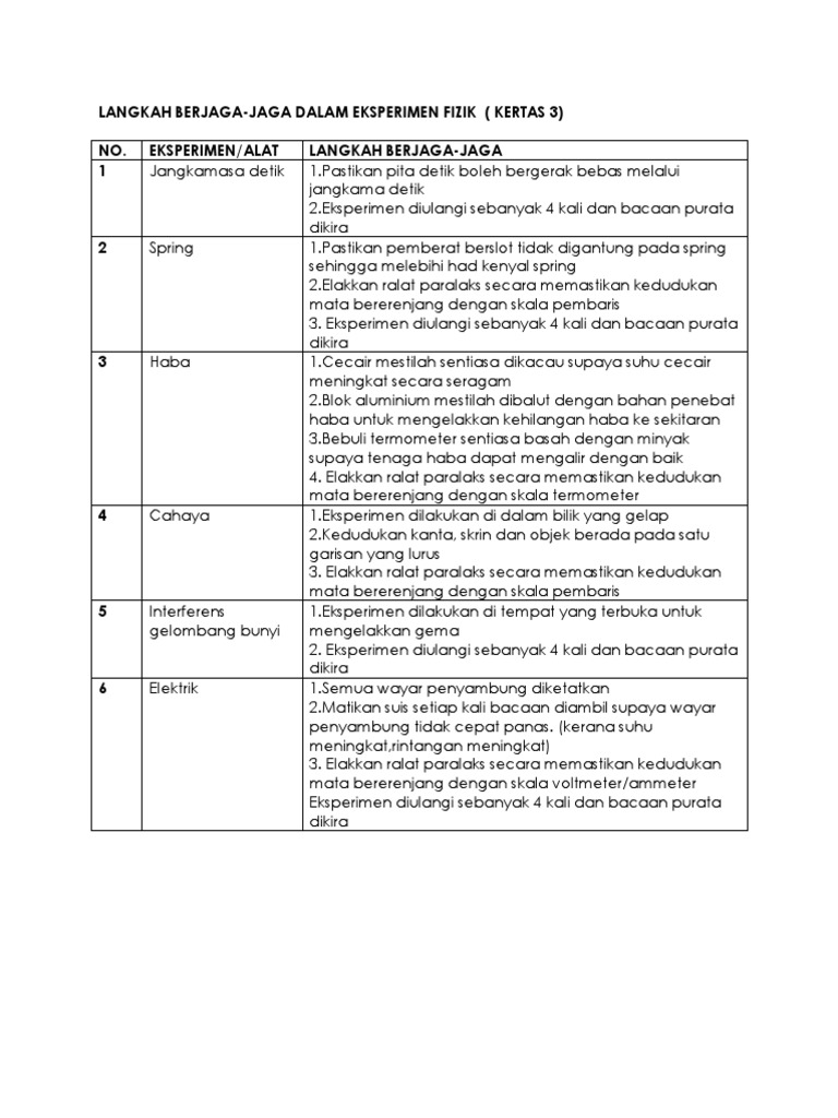 Langkah Berjaga Jaga Dalam Eksperimen Fizik Kertas 3 No Eksperimen Alat Langkah Berjaga Jaga 1